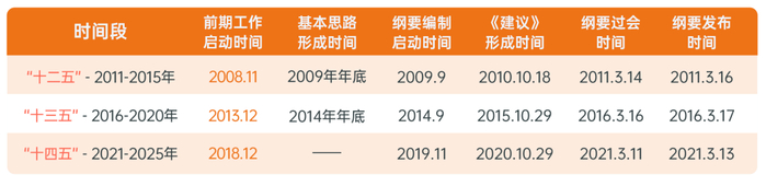 根据国家公开发布的相关信息,我们整理出“十二五”、“十三五”以及“十四五”规划纲要编制过程的基本步骤程序和各个时间节点: