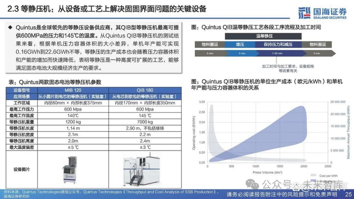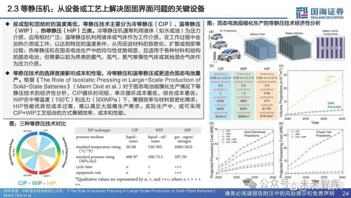 等静压技术的选择直接影响成本和性能,冷等静压和温等静压或更适合固态电池量 产。根据《The Role of Isostatic Pressing in Large-Scale Production of Solid-State Batteries》(Marm Dixit et al.)对于固态电池规模化生产情况下等 静压技术的经济性分析,CIP循环时间短、单次循环成本最低,综合成本最优; WIP在中等温度(150℃)和压力(500MPa)下,兼顾效率与材料致密化需求; HIP性能优异但成本过高,难以满足大规模生产需求。实际生产中,或可采用 CIP+WIP工艺组合的方式兼顾效率、成本和性能。