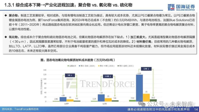 综合成本下降→产业化进程加速:聚合物 vs. 氧化物 vs. 硫化物
