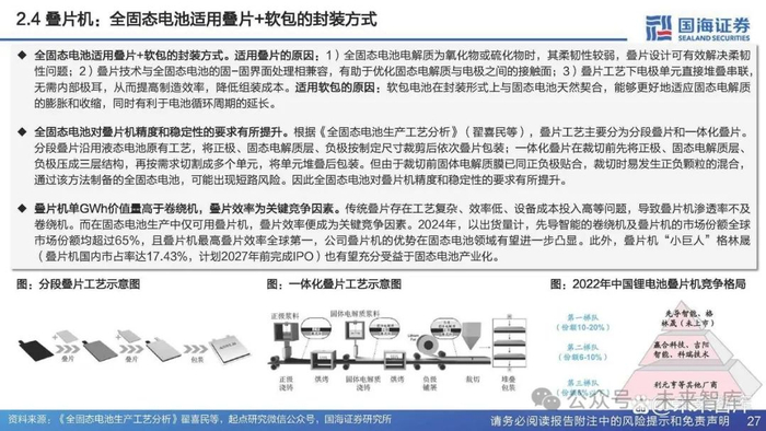 全固态电池适用叠片+软包的封装方式。适用叠片的原因:1)全固态电池电解质为氧化物或硫化物时,其柔韧性较弱,叠片设计可有效解决柔韧性问题;2)叠片技术与全固态电池的固-固界面处理相兼容,有助于优化固态电解质与电极之间的接触面;3)叠片工艺下电极单元直接堆叠串联,无需内部极耳,从而提高制造效率,降低组装成本。适用软包的原因:软包电池在封装形式上与固态电池天然契合,能够更好地适应固态电解质的膨胀和收缩,同时有利于电池循环周期的延长。