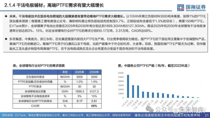 目前干法电极工艺尚未完全成熟,性能和成本是制约其大规模应用的两大前置条件。干法电极工艺面临主要的挑战包括混料均匀性、自支撑膜成型的稳定性、连续制造的效率、高速制备下粘结剂含量的控制,以及与湿法电极的成本竞争力。此外,干法工艺常用的PTFE粘结剂对于固态电池负极稳定性不足,因此负极目前主要采用湿法工艺。