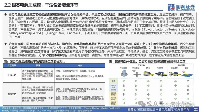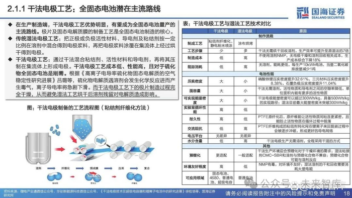 在生产制造端,干法电极工艺优势明显,有望成为全固态电池量产的 主流路线。极片及固态电解质膜的制备工艺是全固态电池制造的核心。
