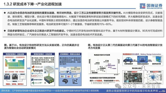 AI正成为全固态电池研发进程的重要加速器,将在材料筛选、设计工艺以及性能管理等方面发挥关键作用。AI大模型将会改变研究范式,文献阅读、报告撰写、模型计算、优化设计等方面都能借助AI,AI赋能下将缩短原有科研实验试错模式下的时间周期,并大幅降低研发成本,加速全固态电池的研发及产业化进展。中国科学院院士欧阳明高表示,通过全固态电池研发智能公共服务平台,能实现材料体系智能匹配、设计参数智能选优,制备工艺智能推荐等研发服务,电池研发效率可提升1~2个数量级,节省研发费用70%~80%。