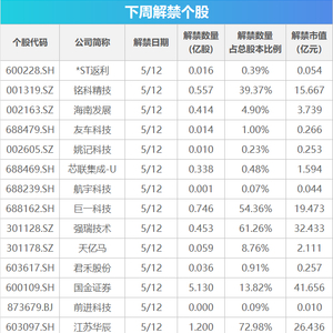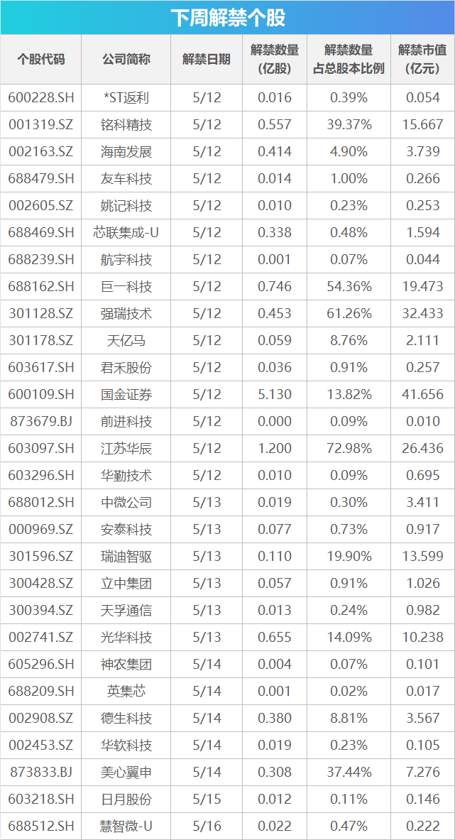 从解禁市值来看,5月12日是解禁高峰期,15家公司解禁市值合计144.69亿元,占下周解禁规模的77.66%。按最新收盘价计算,解禁市值居前三位的是:国金证券(41.66亿元)、强瑞技术(32.43亿元)、江苏华辰(26.44亿元)。从个股的解禁量看,解禁股数居前三位的是:国金证券(5.13亿股)、江苏华辰(1.2亿股)、巨一科技(0.75亿股)。