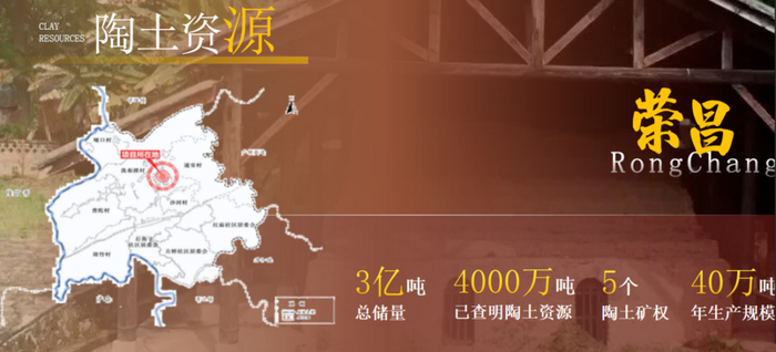 荣昌陶土储量极为丰富,有一条长约25公里、宽2.5-4.5公里的优质矿带。经专业探测与评估,陶土资源总储量可达3亿吨之多,已查明陶土资源近4000万吨,现设置陶土矿权5个,年生产规模最大可达40万吨。