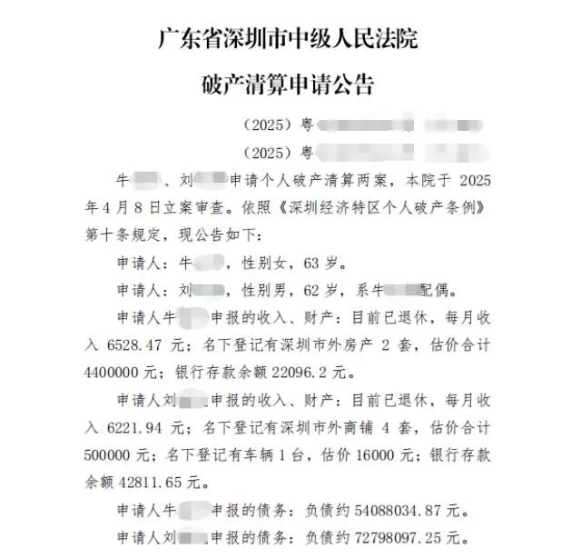 记者从深圳市中级人民法院破产申请公告中看到,62岁男子刘某和63岁的牛某为夫妻关系,两人均申报目前退休状态,其中妻子牛某申报每月收入6528.47元;名下登记有深圳市外房产2套,估价合计440万元;银行存款余额22096.2元。