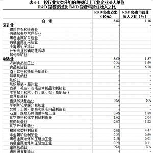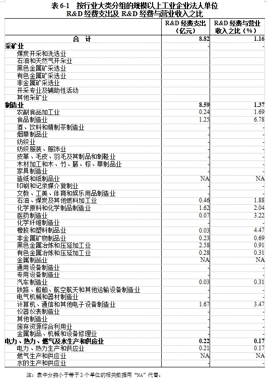 2023年,规模以上工业企业法人单位R&D经费支出8.82亿元,比2018年增长106.3%;R&D经费与营业收入之比为1.16%。规模以上工业企业法人单位分行业R&D经费支出及R&D经费与营业收入之比(详见表6-1)。