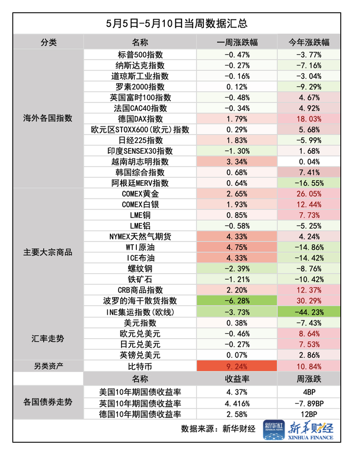 新华财经上海5月11日电(葛佳明) 本周(5月3日至10日)美联储连续第三次议息会议按兵不动,维持基准利率在4.25~4.5%水平,美联储主席鲍威尔在新闻发布会上释放“鹰派”信号,维持观望的态度。美股三大股指本周均累计下挫,欧洲各国股市多数上涨,美元反弹。