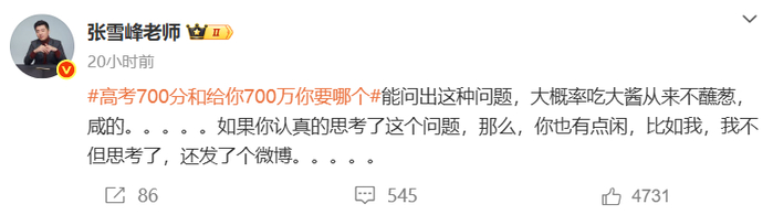 5月10日,话题“高考700分和给你700万你要哪个”登上热搜引发讨论,考研名师张雪峰发文回应。