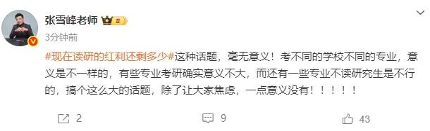 4月25日,张雪峰发文谈“读研的红利还剩多少”,他称:“现在读研的红利还剩多少,这种话题,毫无意义!考不同的学校不同的专业,意义是不一样的,有些专业考研确实意义不大,而还有一些专业不读研究生是不行的,搞个这么大的话题,除了让大家焦虑,一点意义没有!”