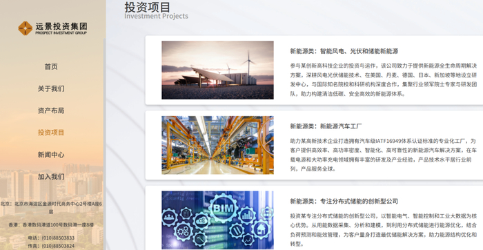 赶碳号储能在其官网上看到,远景投资的业务版图很广,号称“重点布局于不良资产并购及重组、文旅文化、数字科技、消费品、生物医疗、新能源、新基建和汽车制造八大方向”。但在投资项目简介一栏,远景投资的前三类业务都是新能源,包括:
