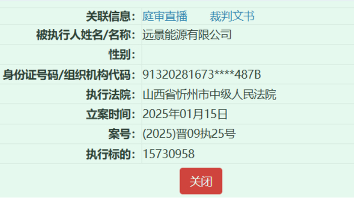 今年1月15日,远景能源有限公司被山西省忻州市中级人民法院强制执行,执行标的为1573.1万元,案号为(2025)晋09执25号。