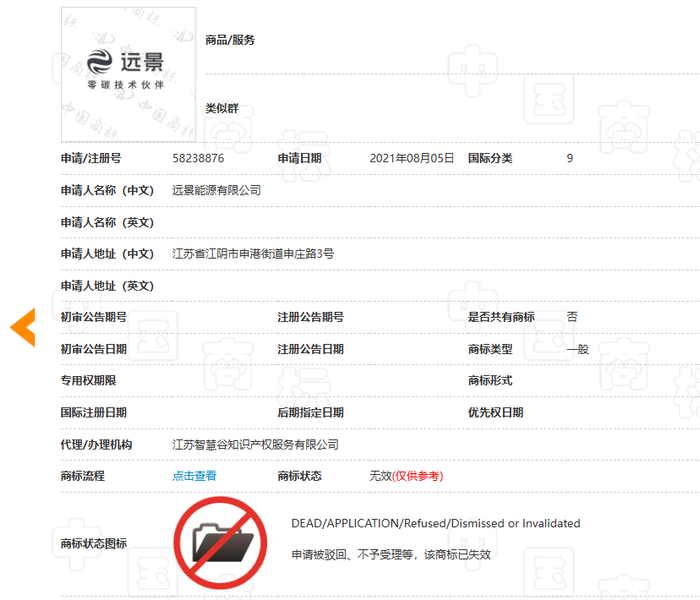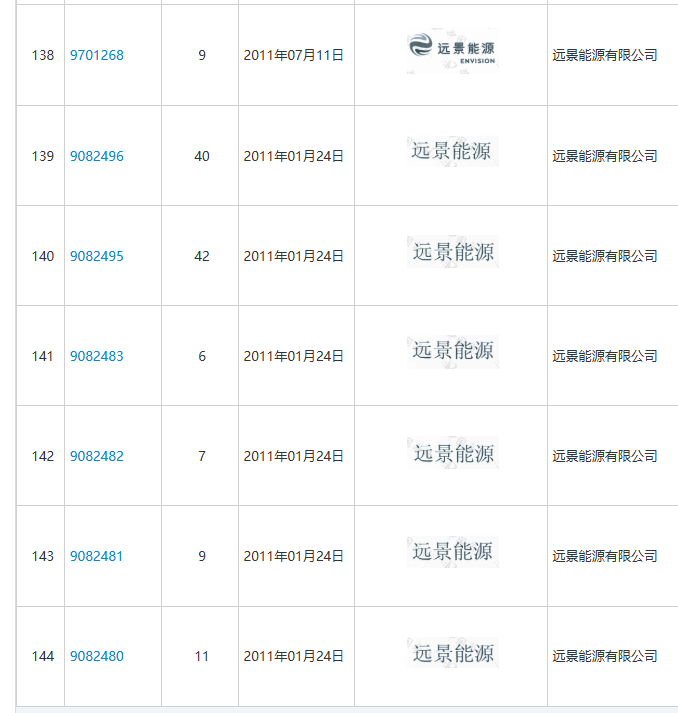 国家商标局官网显示,远景能源申请的第9大类注册号为9082481“远景能源”商标,自2012年2月7日注册生效后已经期满(商标的有效期为10年),目前正处于“撤销/无效宣告申请审查中”。