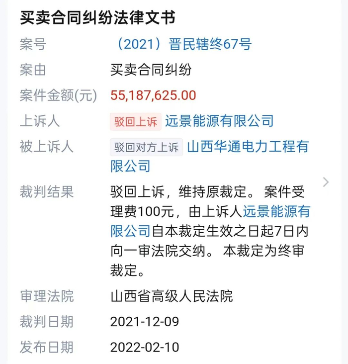 目前,该案的庭审及执行公开信息均处于不可见状态。经查询,远景能源与当地企业——山西华通电力工程有限公司有一起经济纠纷。这家公司最近官司缠身,最近几年晶科能源、阳光电源等知名企业均与其有合同纠纷。
