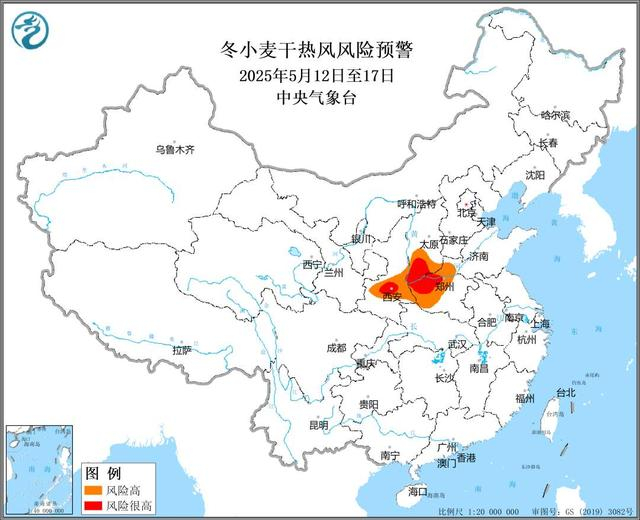 中央气象台预计,5月12日至17日,黄淮中西部、华北南部、陕西关中等地无有效降水,日最高气温将在32℃以上,其中16日至17日将超过35℃,局地可达37℃以上。河南西部、山西南部等地冬小麦干热风风险高,河南焦作、洛阳,陕西渭南、咸阳,山西临汾、运城干热风风险很高。