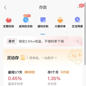 此外,还有银行出现了5年期定期存款利率低于1年期存款利率的情况。招商银行App显示,目前该行“灵动存”产品1年期存款利率为1.6%,而存3年和5年的利率分别仅为1.50%、1.55%。