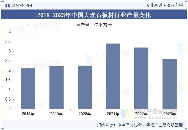 大理石作为重要的建筑装饰材料,其需求与房地产市场密切相关。中国政府对房地产市场进行宏观调控,减少建筑项目的数量,进而减少大理石的需求和产量。2020年一季度,受新冠疫情的影响,大理石板材的产量进一步下降,一季度大理石板材产量为0.61亿平方米,同比大幅下降了79.0%。尽管随着国内疫情的好转,大理石板材产量有所回升,但整体来看,近两年中国大理石板材产量呈现出下降的趋势。2023年中国大理石板材产量为2.6亿平方米。