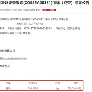 近日,有网友发消息称,2025年5月发布的《重庆三峡学院防火墙及DNS设备采购(CQS25A00331)中标(成交)结果公告》中,重庆三峡学院采购的“普联TL-R473G出口防火墙”,中标价格为75万元一台,但该型号产品在某电商平台普联官方旗舰店售价仅299元,质疑其中标价格不合理。