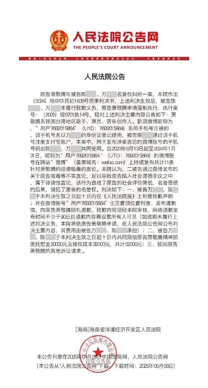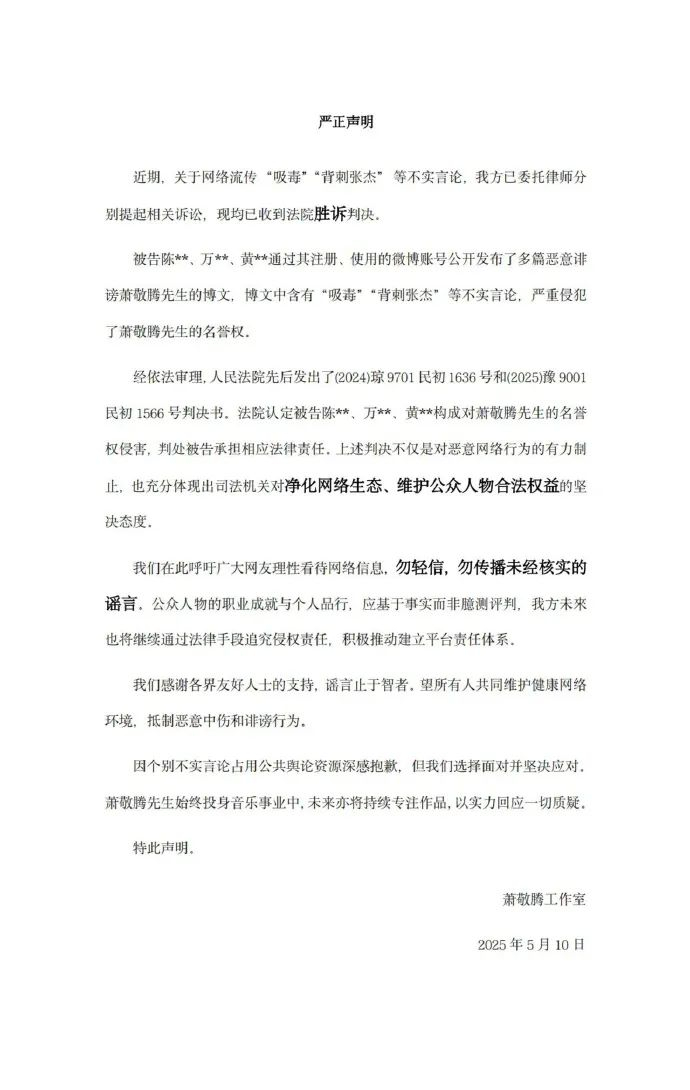 5月11日,萧敬腾工作室发文称,关于网络流传 “吸毒”“背刺张杰” 等不实言论,已委托律师分别提起相关诉讼,现均已收到法院胜诉判决。