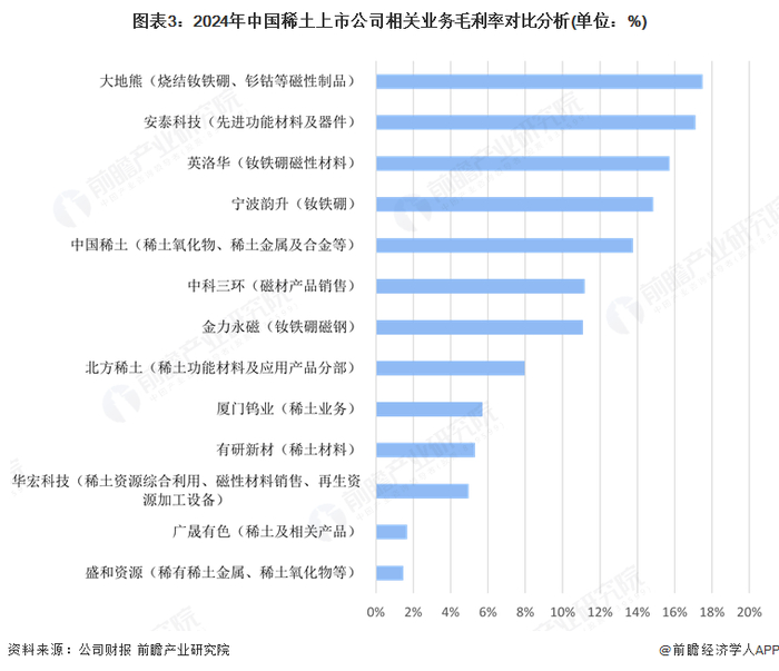 从上市公司稀土业务的盈利水平上看,稀土行业上市公司稀土业务毛利率差异显著。大地熊的烧结钕铁硼、钐钴等磁性制品业务以17%的毛利率位居首位,而盛和资源、广晟有色的稀土业务毛利率不足2%。整体而言,稀土行业上市公司毛利率分布较为分散,部分公司毛利率较高,如大地熊、安泰科技等,表明其在稀土业务上具有较强的盈利能力;而部分公司毛利率较低甚至为负,可能与其业务模式、成本控制、市场竞争等因素有关。