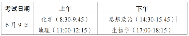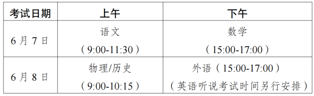 其中,6月7日上午考语文,下午考数学;6月8日上午考物理、历史,下午考外语;6月9日上午考化学、地理,下午考思想政治和生物学。
