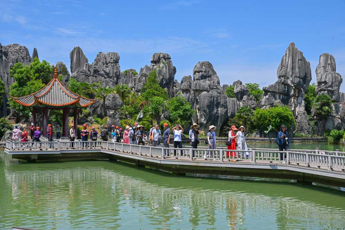 5月11日,游客在云南省昆明市石林彝族自治县境内石林景区内游玩。当日,该景区迎来旅游高峰,众多游客穿梭于奇峰异石间,领略壮丽景观。
