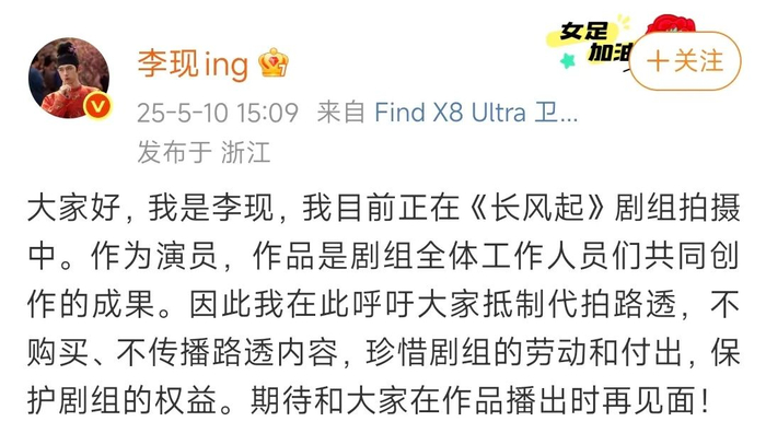 李现表示“作为演员,作品是剧组全体工作人员们共同创作的成果。因此我在此呼吁大家抵制代拍路透,不购买、不传播路透内容,珍惜剧组的劳动和付出,保护剧组的权益。”