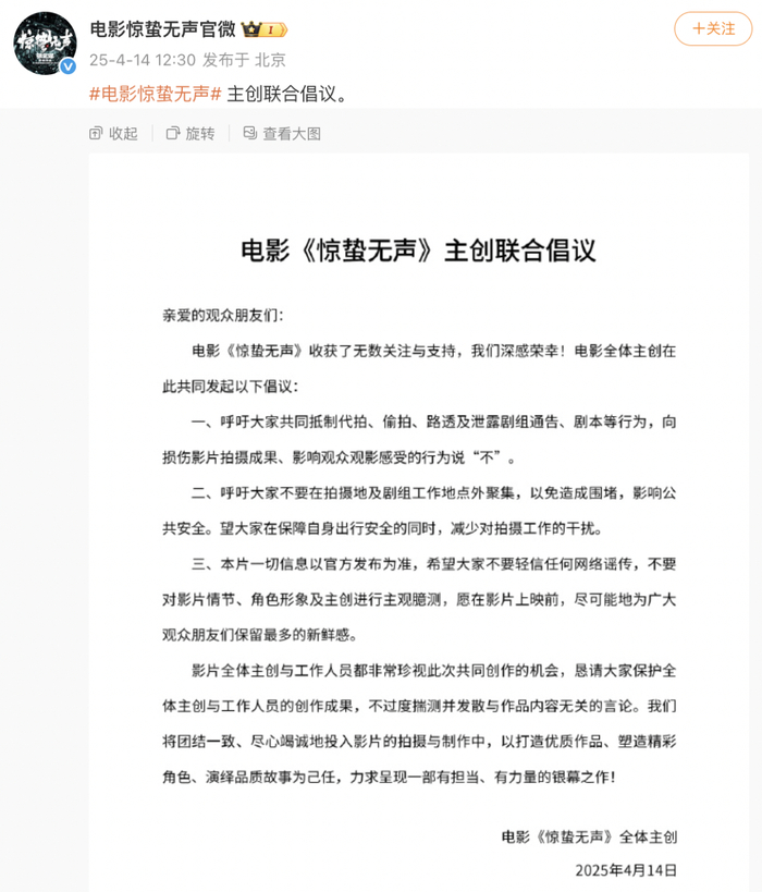 4月14日,电影《惊蛰无声》发布主创联合倡议,呼吁大家共同抵制代拍、偷拍、路透及泄露剧组通告、剧本等行为;呼吁大家不要在拍摄地及剧组工作地点外聚集,以免造成围堵,影响公共安全。