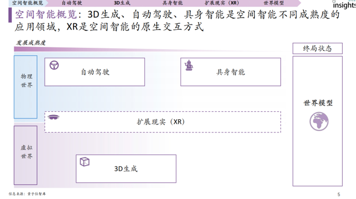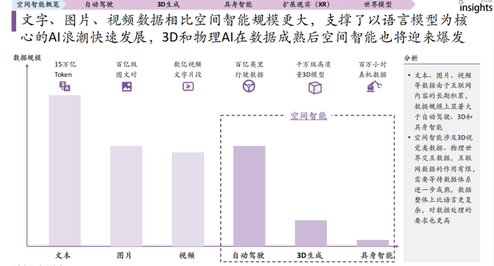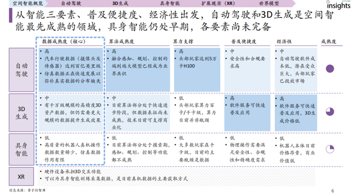空间智能融合3D理解、生成、推理与交互,3D生成、自动驾驶、具身智能是其不同成熟度的应用领域,XR则是原生交互方式。从成熟度看,自动驾驶和3D生成相对领先,具身智能尚处早期。数据规模和体系成熟度是关键,空间智能数据处理要求高于文本、图像等数据,目前其数据体系成熟度为自动驾驶>3D生成>具身智能 。