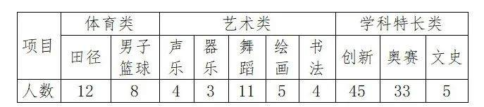 (1)田径类:初中阶段参加行政管理部门组织的比赛获得省级前八名;市级比赛前六名;区级前三名或经过专业训练具备一定的跑跳投能力,身体素质比较突出。