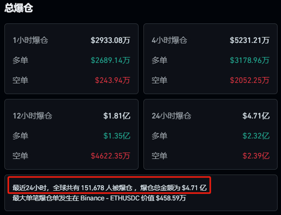 Coinglass数据显示,加密货币过去24小时内超15万人爆仓。