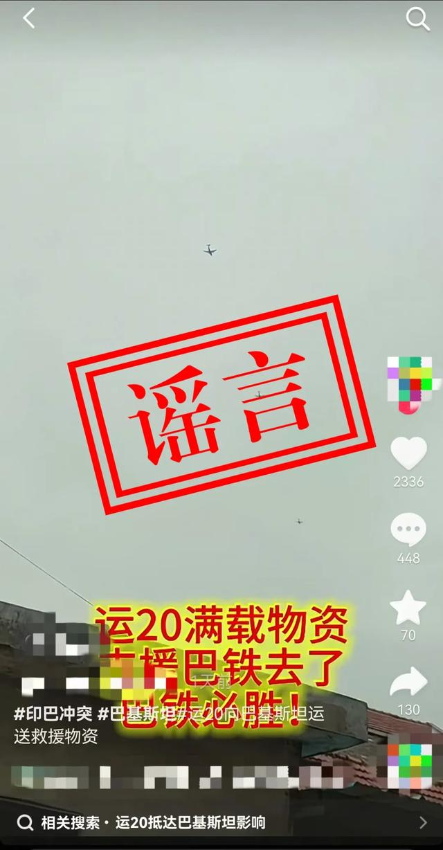 5月11日晚,人民空军官方微信公众号发布消息称:近日,网络上出现大量关于“运-20向巴基斯坦运送救援物资”的消息。对此,人民空军表示,此消息为不实信息!