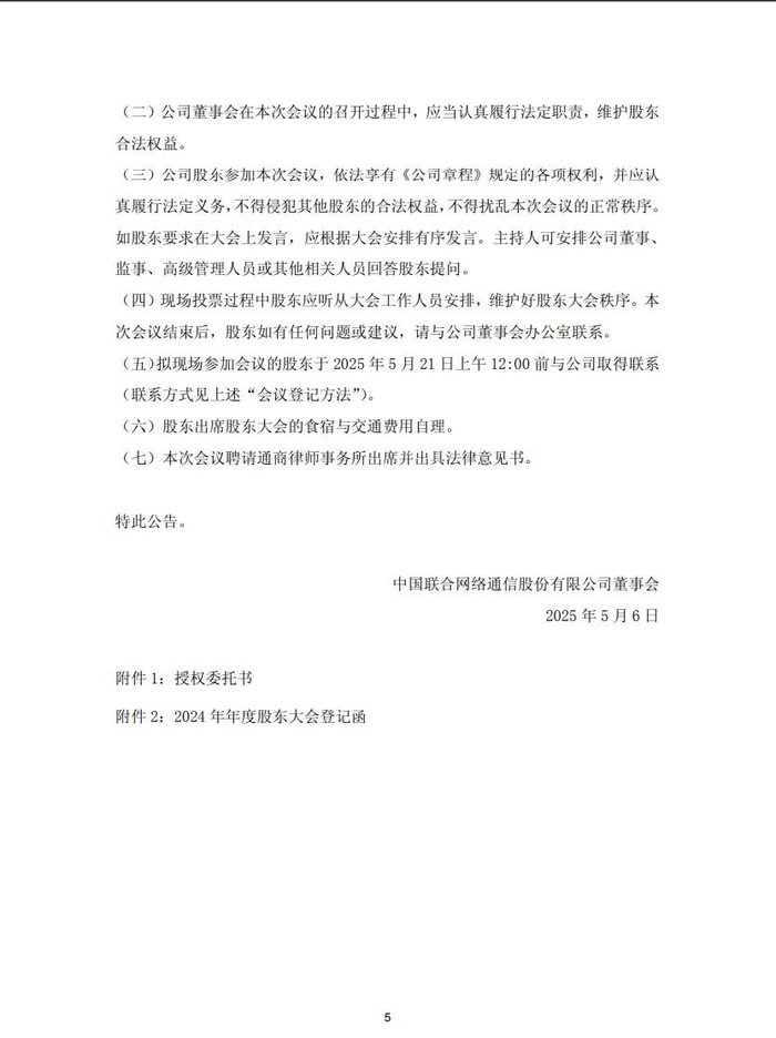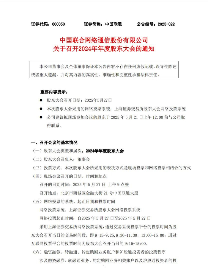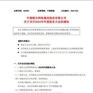 5月9日消息,中国联通发布公告,将于2025年5月27日召开年度股东大会,网络投票同日进行。股权登记日为5月19日,当日收市后持有中国联通股票的投资者可以参与投票。