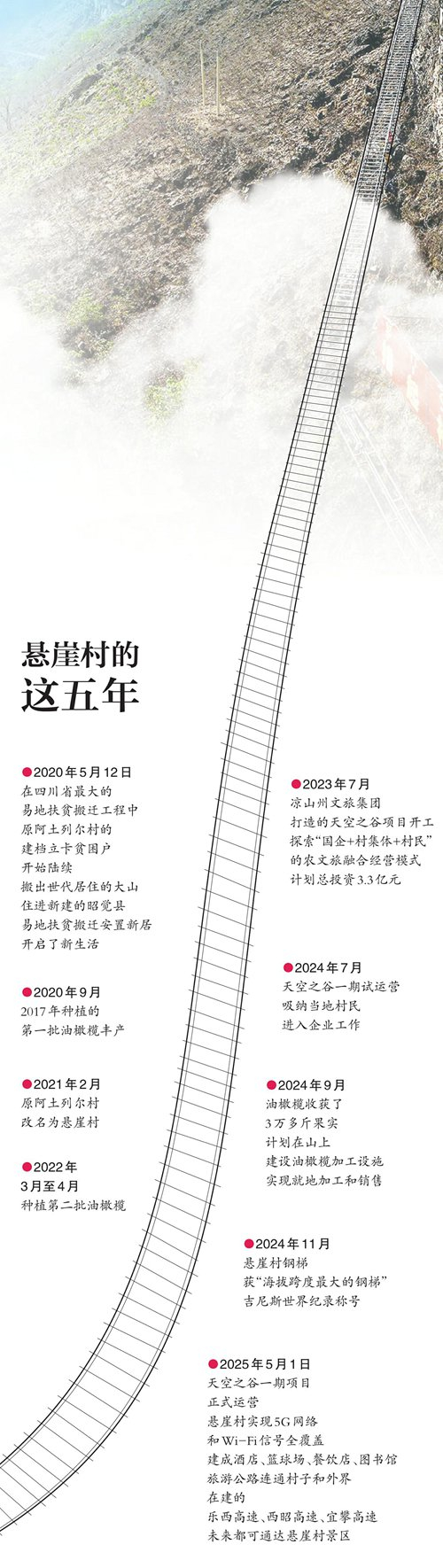 □四川日报全媒体记者 刘莉 王成栋 杜杰 何勤华/文 华小峰 赵明/图有这样一句彝族谚语:有圆根(萝卜)不会挨饿,有羊子不会受穷。在凉山州昭觉县悬崖村,山羊曾是村民最珍贵的财产和最重要的朋友。2020年5月12日,悬崖村人告别钢梯,告别了悬崖上的日子,迁入了县城的宽敞新居——昭觉县城的昭美、沐恩邸等4个社区。5年过去,悬崖村人的生活,已发生很大的变化。但人与羊的故事,似乎还远未结束。下山的羊悬崖村人在县城开的第一家餐馆,卖的是山上的羊“你们店最大的特色是什么?”“悬崖村的山羊肉。”“怎么卖?”“一斤羊肉汤锅,118元,比其他馆子贵一些。”……清晨,昭觉县人民中路的悬崖飞羊馆,老板莫色尔体和顾客聊了起来。这家去年6月开业的特色羊汤馆,是5名悬崖村人(莫色尔体、莫色布且、莫色拉博、莫色拉洛、莫色木一)在昭觉县城开的第一家餐馆。餐馆的布置别出心裁。为了让客人体验登顶悬崖村的感觉,餐馆特意选在了三楼;5个包间分别用5位合伙人的家命名,比如“尔体家”,再加上标注——“悬崖村1组1号”;每个包间内,都摆放着每位合伙人从悬崖村背下来的老斗橱,墙上的照片,是悬崖村的老房子和山羊。开着“羊”味十足的餐馆,5位合伙人对羊是又爱又恨。莫色尔体说,悬崖村土地贫瘠,长出的土豆、玉米和荞麦只够糊口,养羊可以多挣点钱。因此,羊成为希望的寄托。在悬崖村,不少孩子的学名姓氏就是“杨”。比如,莫色布且的汉名就叫杨帆。但养羊的经历实在痛苦。被网友称为“悬崖飞人”的莫色拉博,小学还没毕业就拿起鞭绳漫山赶羊。为何要开羊汤馆?“为了让悬崖村的羊卖个好价钱!”莫色尔体说,过去悬崖村人在山下卖羊,总会被商贩砍价。“背下山的羊不会再背回去,商贩吃准了这点,这让我们很不服气。”如今,悬崖村村集体成立了养殖专业合作社,算上村民散养的山羊,每年出栏量有三四百只,比搬家前高出不少。大伙在县城开设羊汤馆,既让悬崖村的羊卖出好价钱,也能借此机会打响悬崖村山羊的品牌。更何况,下了山的悬崖村年轻人,也需要出路。从来没做过生意的悬崖村人,能把餐馆做得长久吗?莫色尔体说,餐馆开业至今10个多月,每月能卖10多只羊,逐渐实现盈亏平衡。但合伙人也感受到了创业的压力,大家认为要想将餐馆长久经营下去,必须想更多的办法。莫色尔体说,接下来餐馆将开发更多新菜品,推出全羊宴,让悬崖村的羊“销路再宽一点、价格再高一点”。下山的人村民很快有了新朋友和新生活,大伙儿不再比谁家的羊多,而是比谁家孩子读书好“又去跳广场舞啰!”中午,家里没有发现妻子阿合金里的身影,吉克拉里笑了,“也好,不合群的羊长不好。”搬家之初,吉克拉里一家在昭美社区的“朋友圈”只有几户悬崖村同乡。随后,社区干部每个月组织一次文娱活动,阿合金里很快有了新闺蜜和舞伴。是否融入新生活,杨铝洗的判断依据是“老家悬崖”微信群的活跃度。5年前,包括杨铝洗在内的27户原悬崖村人,搬进了沐恩邸社区,大伙建起了“老家悬崖”微信群。最初,每天聊天信息动辄上百条。如今,最新一条群聊天记录停留在今年春节,那天,160多位悬崖村人回老家参加了新春团聚会。下山5年,昭美社区文书、悬崖村人莫色格服的工作内容发生了很大的变化。他说,第一次住楼房的悬崖村人,总记不住新家的楼栋单元和门牌号,“最初的主要工作,就是帮老乡找家。”村民们加速适应新生活,让刘长江欣喜又失落——5年过去,一度是社区“红人”的他,竟然“失业”了。刘长江是成都建工第五建筑工程有限公司的员工,该公司负责修建和维护悬崖村人搬入的社区。2020年下半年,水电工出身的刘长江就忙得不行。忙什么?开锁和修电器。原来,悬崖村人过去出门不锁门,没有带钥匙的习惯。到了新社区,常常一出门就回不了家。不少人没用过冰箱、洗衣机等家电,对电器的使用不熟悉。直到2023年下半年,刘长江明显感觉到求助的人变少了。2024年,在连续两个月“零接单”后,刘长江所在的工区正式撤销,并把维护任务移交给当地。悬崖村人的生活方式变了,想法也变了。在莫色日服家的客厅,有一张被裱起来的证书,那是他的起重装卸机械操作工初级证书。去年6月,只读过小学的莫色日服,在社区接受了3个月培训,最终成为100多名应考者中的7名过关者之一。“有了这个证,我的收入增加了两三成。”莫色日服说,相比以前,这里的日子很安逸。孩子的教育也是变化的风向标。“你的作文,爸爸都要查字典才能看懂啦!”4月19日傍晚,检查完女儿的作业后,悬崖村人某色拉几满脸骄傲。他说,村民们不再比谁家的羊多,而是比谁家孩子读书好。进阶的产业曾经在悬崖村人心里,羊才是宝贝,没想到油橄榄后来居上,旅游业也有了稳定收入吉克拉里和某色苏不惹,“掌管”了悬崖村村集体经济的两大产业:一个负责给合作社养羊,一个负责管护油橄榄。看着羊儿在绿油油的橄榄林里跳跃,吉克拉里若有所思。多年来在他心中,羊才是宝贝,但没有想到,油橄榄取代了羊的地位。5月8日晚,连续高温干旱后,悬崖村迎来了一场暴雨。“明天要撒肥!”眼见雨势越来越大,某色苏不惹冲出工棚,趴在含苞待放的油橄榄花骨朵前,看了又看,十分欢喜。喝饱了雨水,油橄榄肯定能顺利开花。2017年,悬崖村引入社会资本,流转土地集中种植160亩油橄榄,并约