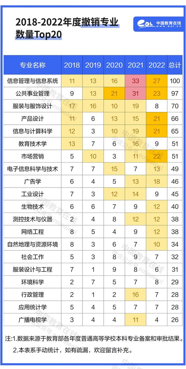 据2018-2022年的统计数据显示,信息管理与信息系统专业共有100所高校撤销,排名第一;公共事业管理专业共97所高校撤销,排名第二;此外,服装与服饰设计(70)、产品设计(66)、信息与计算科学(65)、教育技术学(51)、市场营销(51)、电子信息科学与技术(49)、广告学(46)、工业设计(45)和生物技术(40)被撤销也较多,且已多年位居前列。