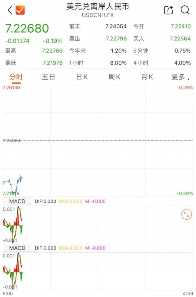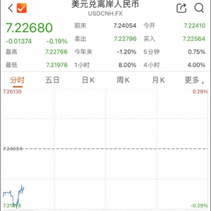 北京时间周一,离岸人民币盘中突然拉升。美元对离岸人民币汇率一度跌逾200点,随后跌幅有所收窄,现报7.2268。