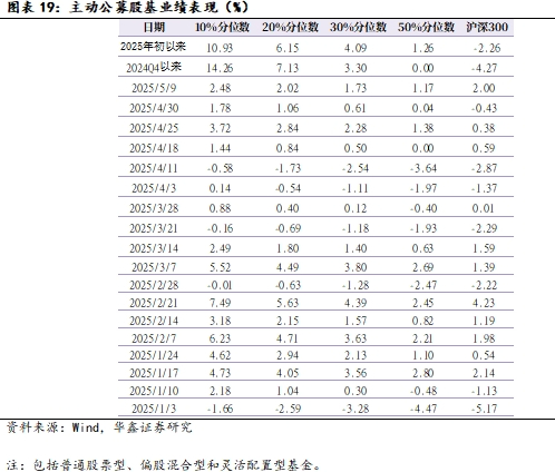 5月第1周(5.6-5.9)主动公募股基多数跑输沪深300。其中10%、20%、30%和50%周度涨跌幅分别在2.5%、2%、1.7%、1.2%,沪深300周度上涨2%。