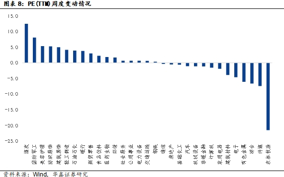 本周申万一级行业PE(TTM)中煤炭、国防军工、美容护理、纺织服饰、建筑装饰涨幅最大,变动幅度分别在12.5%、8.1%、5.3%、5.3%、5%,农林牧渔、传媒、综合、有色金属、电子跌幅最大,估值变动幅度分别在-21.6%、-7.4%、-6.6%、-6.1%、-4.6%。