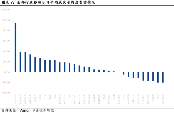 本周全A日均成交量1.35万亿元较上周1.1万亿元有所上升。国防军工、家用电器、机械设备、纺织服饰、计算机成交量同比增速最高,成交量变动分别在94.3%、38.9%、37.9%、33.7%、28.4%。美容护理、煤炭、房地产、食品饮料、公用事业成交量涨幅最小,成交量变动分别在-20.5%、-20.5%、-17.7%、-16.8%、-16.7%。