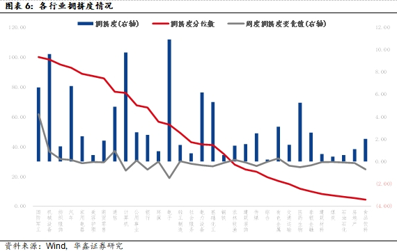 截至5月9日,拥挤度前五的行业为电子、计算机、机械设备、汽车、国防军工,分别为10.9%、9.7%、9.6%、6.7%、6.6%。排名后五为综合、煤炭、美容护理、石油石化、钢铁,分别为0.2%、0.4%、0.6%、0.6%、0.6%。