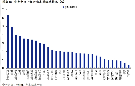 本周A股放量上涨。上证指数涨1.9%,深证成指涨2.3%,创业板指涨3.3%。申万一级行业中国防军工、通信、电力设备、银行、综合涨幅最大,本周分别上涨6.3%、5%、4%、3.9%、3.6%,房地产、电子、商贸零售、石油石化、农林牧渔跌幅最大,周度涨跌幅分别在0.4%、0.6%、0.9%、0.9%、1%。