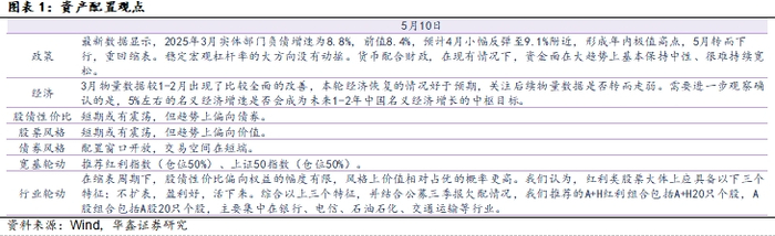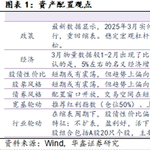 在2025年两会后,我们进一步坚定了趋势上对国家资产负债表两端的判断。始于1月中(1月13日当周)的扩表,已于2月中(即2月17日当周)结束,横跨春节共计6周,资金面配合程度不强,期限利差大幅压缩,在一系列消息扰动下,扩表末端、缩表初端风险偏好的提升超出了我们的预期。最新数据显示,一月末时点数衡量,4月有望形成年内政府和实体部门负债增速的高点,5月重回缩表。美国目前的情况与互联网泡沫破裂时(2001年)非常相似,川普政府一系列逆全球化操作,也正是上述经济背景下看似偶然、实则必然的结果。最新公布的数据显示,美国一季度实际GDP同比增长2.1%,虽然低于过去三年的经济增速(2.5%、2.9%、2.8%),但仍然高出美联储给出的趋势水平(1.8%),目前包括美联储在内的国际主流机构对美国今年经济增速的预估都是回归趋势水平附近,我们重点关注后续美国季度实际GDP同比增速能否以及何时跌破趋势水平。债市方面,一年期国债收益率高于目前政策利率对应的区间下沿,或在中枢位置附近,上行风险不大;但期限利差过于狭窄,十年国债和一年国债的期限利差收窄至20个基点附近,已经是2018年初金融去杠杆结束以来的最低水平,或反映了市场对经济过度悲观的预期。考虑到十债收益率已重新回到前期低点(1.6%)附近,价值类权益资产有望逐步展现出相对更优的配置价值。本周我们继续满仓价值,推荐红利指数(仓位50%)、上证50指数(仓位50%)。
