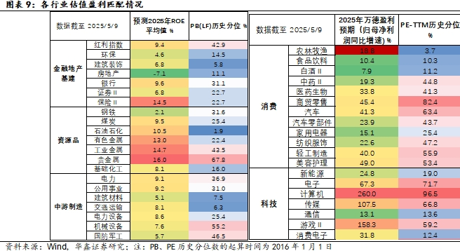 估值盈利匹配方面,截至2025年5月9日,2024年全年盈利预测较高,且当下估值相对历史偏低的行业有保险、煤炭、石油石化、有色金属、医药生物、消费电子。