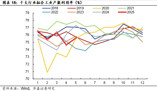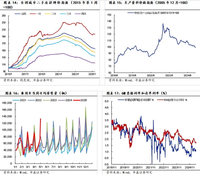 内需方面,最新一周二手房价格下跌,数量指标涨跌互现。高速公路货车通行量回升, 2025年3月十行业拟合的产能利用率升至历史较高水平,4月明显回落,5月小幅回升。汽车成交量处于历史同期较高水平,新房成交持续处于历史最低,二手房成交相对历史季节性仍处高位。截至5月4日,全国城市二手房挂牌价指数微跌,环比下跌0.26%。截至5月2日,生产资料价格指数环比下跌0.3%。