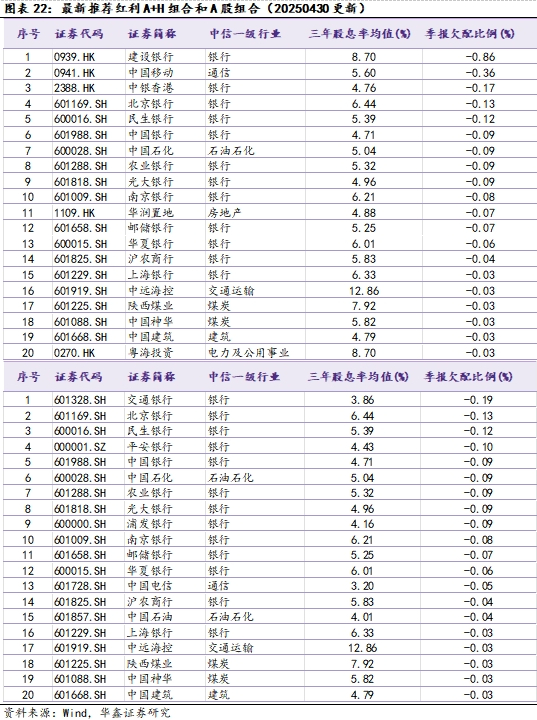 在缩表周期下,股债性价比偏向权益的幅度有限,风格上价值相对占优的概率更高。我们认为,红利类股票大体上应具备以下三个特征:不扩表,盈利好,活下来。综合以上三个特征,并结合公募四季报欠配情况,我们推荐的A+H红利组合包括A+H20只个股,A股组合包括A股20只个股,主要集中在银行、电信、石油石化、交通运输等行业,由于部分行业个股数量较多, 银行等行业个股进行适当精简。