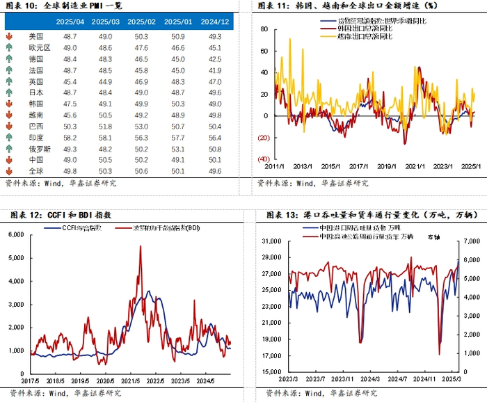 外需方面,普遍走弱。4月全球制造业PMI自50.3回落至49.8,4月已经披露的主要经济体PMI多数回落。CCFI指数最新一周环比下跌0.12%。港口货物吞吐量回升。韩国3月出口增速升至3.1%,4月升至3.7%。越南出口增速自3月的13.2%升至4月的21%。