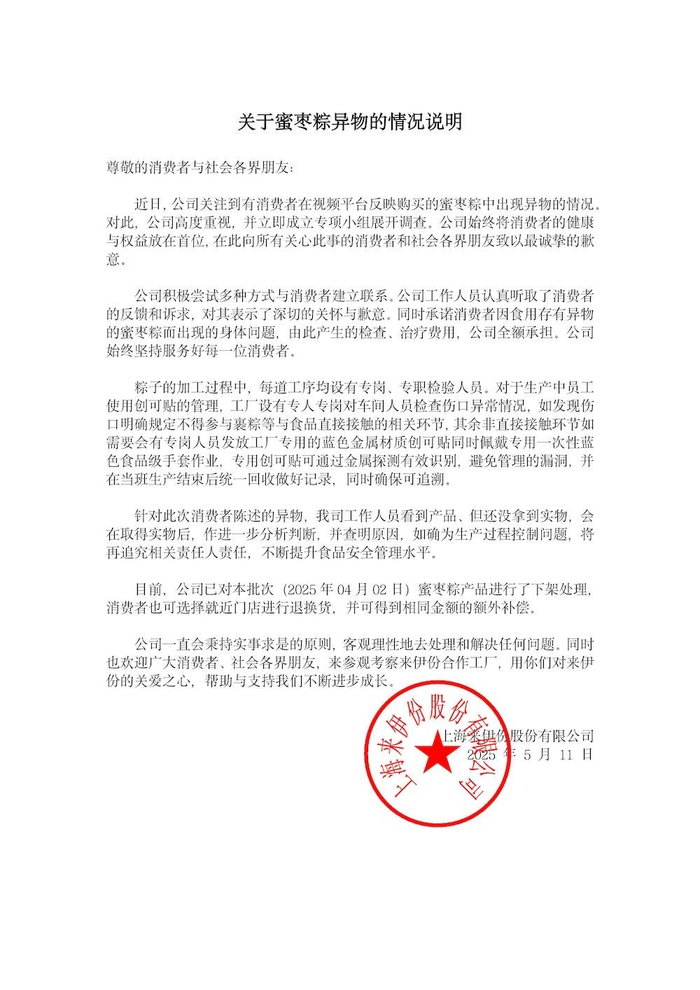5月12日凌晨00:13,来伊份官网发布《关于蜜枣粽异物的情况说明》。