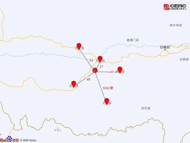 震中距拉孜县21公里、距萨迦县47公里、距定日县49公里、距昂仁县53公里、距定结县65公里,距日喀则市136公里,距拉萨市357公里。