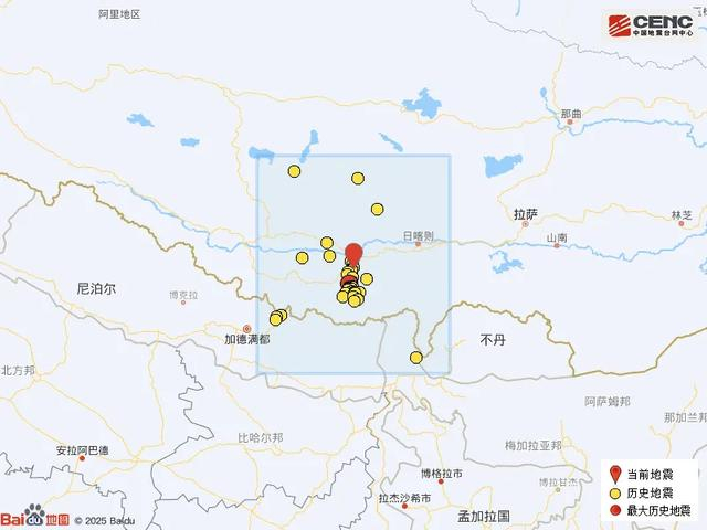 根据中国地震台网速报目录,震中周边200公里内近5年来发生3级以上地震共127次,最大地震是2025年1月7日在西藏日喀则市定日县发生的6.8级地震(距离本次震中46公里),按震级大小前50次历史地震分布如图。