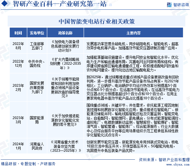 近年来,国家出台相关政策推动智能变电站发展,为智能变电站的发展提供了良好的政策环境。例如,2023年3月,国家能源局印发《关于加快推进能源数字化智能化发展的若干意见》,提出要围绕重点领域、关键环节、共性需求,依托能源工程因地制宜挖掘和拓展数字化智能化应用,重点推进在智能电厂、新能源及储能并网、输电线路智能巡检及灾害监测、智能变电站、自愈配网、智能微网、氢电耦合、分布式能源智能调控、虚拟电厂、电碳数据联动监测、智慧库坝、智能煤矿、智能油气田、智能管道、智能炼厂、综合能源服务、行业大数据中心及综合服务平台等应用场景组织示范工程承担系统性数字化智能化试点任务。2024年1月,河南省人民政府印发《河南省重大技术装备攻坚方案(2023—2025年)》,创新发展节能变压器、新能源发电专用预装式变电站、核电1E级交流中低压开关、环保型高压开关、5G智能充电桩,巩固提升中低压装备产品优势。